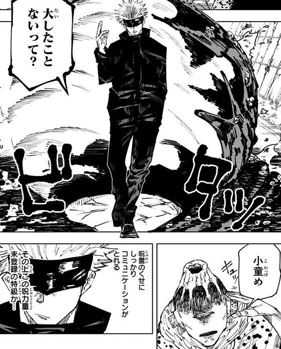 漏瑚は連続攻撃で五条を殺そうとしますが攻撃は全く当たらず、それどころか五条が作り出した「無限」によって五条に触れることすら出来ません。さらに五条の術式反転「赫」によって吹き飛ばされて、漏瑚は重傷を負います。