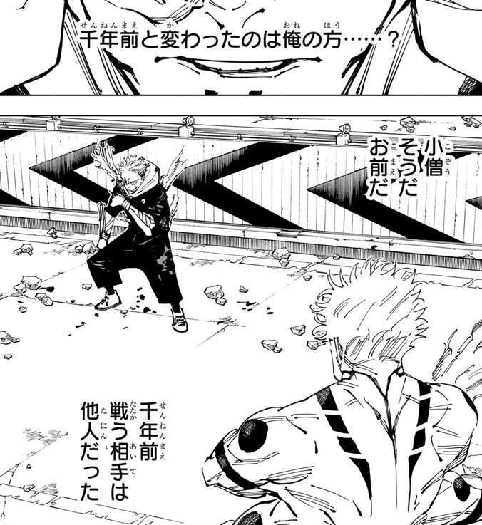 乙骨は領域展開「真贋相愛」で今まで模倣した術式を使用して、宿儺を徐々に追い詰めていきます。さらに虎杖の、宿儺と伏黒の魂の境界を知覚し打ち込む攻撃により“浴”で沈んだ伏黒の魂が叩き起こされ、宿儺と伏黒の肉体の同調を阻害します。虎杖と乙骨はここで決着をつけようと、宿儺をさらに追い込んでいきます。