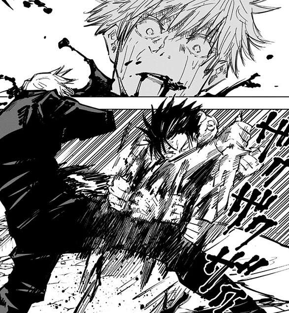 伏黒甚爾は天内の死体を盤星教の代表役員に引き渡し、多額の報酬を受け取ります。しかし、仲介役と別れ一人になった伏黒甚爾の前に殺したはずの五条が現れます。五条は死に際で掴んだ呪力の核心によって、反転術式が使えるようになっていました。五条は反転術式を使って自分自身を治癒、さらに反転術式によって生まれた正のエネルギー、そのエネルギーを無下限の術式に流し込み術式反転「赫」を使用します。