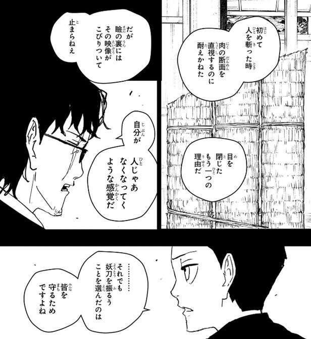 再び場面はチヒロの回想となり、座村は始めて人を斬った時の感覚をチヒロに教えます。そして、それでも皆を守るために妖刀を振る事を選んだが、チヒロが目指すようなところでないと座村は言い、俺は地獄行きだと断言します。座村の言葉に憧れはやめて尊敬にするとチヒロが言うと、それならどしどししてくれよ、と座村は答え、そもそもお前剣士目指してるんじゃねぇだろ?と、座村はチヒロに質問します。……はい、俺は…、とチヒロが言いかけた所で、回想は終わります。