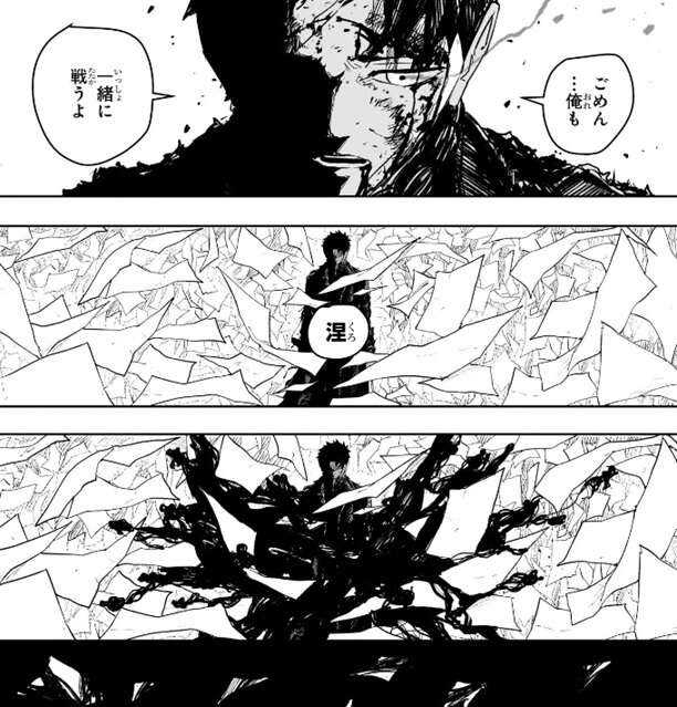 父親の六平国重や座村はチヒロに“地獄(こっち)に来るな”と言っていましたが、チヒロは彼らと一緒に戦う事を選びます。そして、チヒロが“涅”を使うと大量の黒い金魚が現れます。