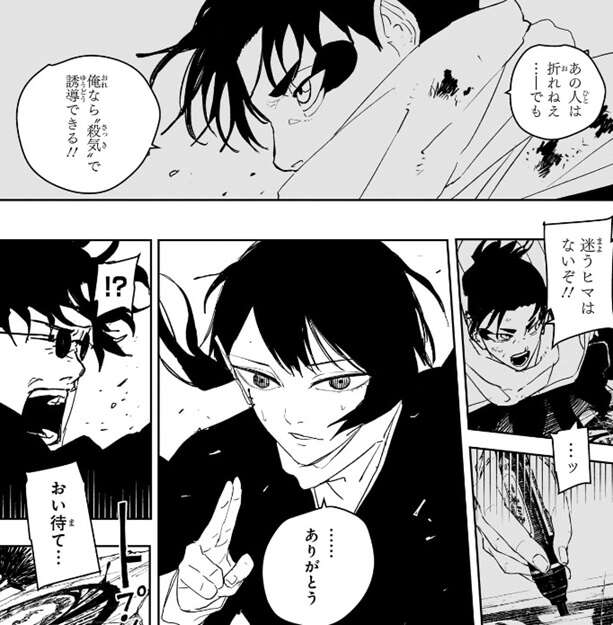 毘灼の幹部が生やした松が建物を破壊した影響で、建物が限界にきて崩壊を始めます。毘灼の幹部は、先に建物の限界が来たか、こっちも終わらせよう!と言うと、敵の妖術師がさらに襲い掛かってきます。一方、座村は轟音と硝煙で感覚が機能しなくなっていて、視界で最も光るのは“殺気”、座村はその殺気という灯に斬りかかっていました。そして座村はこの混沌の中一際輝く灯に、座村の殺意は導かれて、そちらへと移動し斬りかかります。