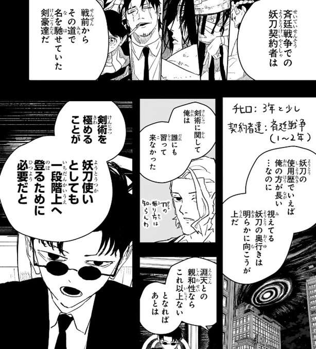 巻墨の隊長・郎から、そりゃ過言だろ、と言われますが、座村と対峙した時に決定的な差があった、それが自分にはない圧倒的な“剣術”だ、とチヒロは言います。斉廷戦争での妖刀契約者は戦前からその道で名をはせていた剣豪達で、妖刀の使用歴で言えばチヒロは3年以上淵天を使っていますが、視えている妖刀の奥行は斉廷戦争時の妖刀契約者の方が明らかに上だとチヒロは言います。チヒロの話を聞き、剣術を極める事が、妖刀使いとしても一段階上へ登るために必要だと、と郎はチヒロの考えを代弁します。