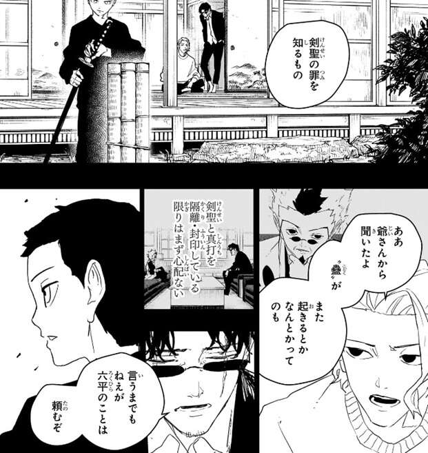 幽は別の黒スーツの男と会話をしていますが、少国民の掃討、剣聖の起こした事件に関して証拠はないと断言します。神奈備が全てを削除していて、さらに町にばら撒いたのは条約と剣聖の事件の一連を記した文書、条約と調印式の偽造書写だったことを黒スーツの男に話します。嘘か本当か怪しいですが、真実に基づいている、説得力はあると幽は言います。ただ、事実に基づいているとはいえ利口な人間は流されないだろうとも幽は言い、そもそも英雄を“人殺し”と中傷する輩はいると言います。ただ、相手は最強の剣豪、どいつも抽象的な中傷は尻込みする、だからじわじわとやると幽は言います。座村はゴミをバラまいていた町の人間の話を聞いて半年前、イヲリが学校に通い出した頃には既に嫌がらせを受けていたのだと気付きます。