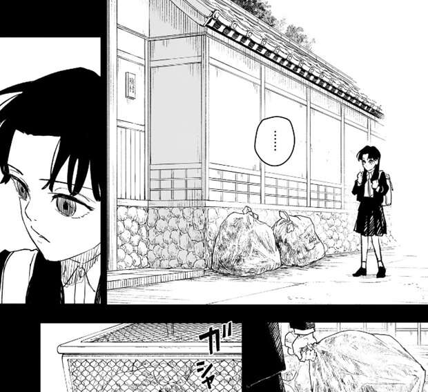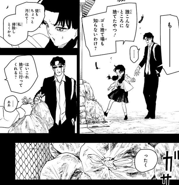 イヲリは自宅の外に捨てられたゴミを自分でゴミステーションへと捨てに行きます。一方、座村清市は同じ道場の父親仲間に、イヲリの学校生活を相談しています。