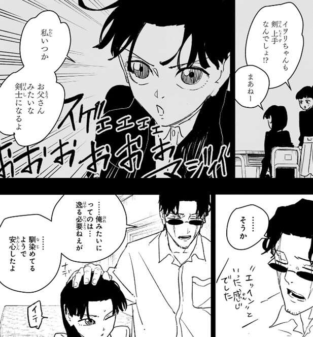 座村の道場仲間はきっともう馴染んでいると楽観的ですが、座村は“座村清市の娘”という事でイヲリが学校で上手くやれているか不安です。しかし、イヲリは授業でも父親が英雄という事でチヤホヤの嵐だったと言い、大丈夫だったと言います。