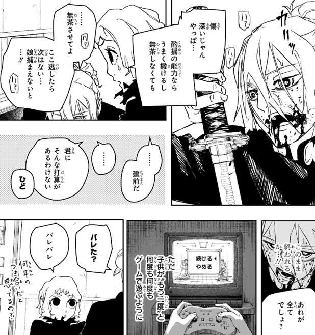 昼彦は座村にとって娘がいるこの状況はイレギュラーだから少なからず動揺があるはずと考え、斗斗にイヲリを捕えるように言います。そして、昼彦は酌揺の能力『宴』を使って座村に対応しようとしますが、それよりも早く座村は斗斗の首を斬り落とします。