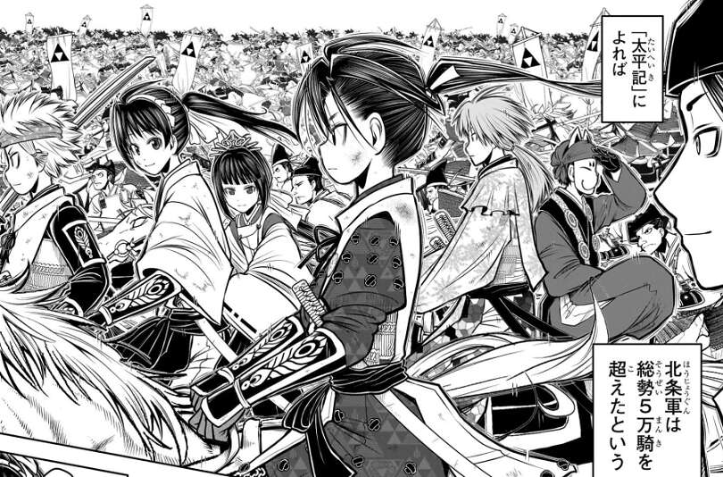 11巻では、北条軍 vs 足利軍の戦いに一区切りがつきます。今川との戦いは、吹雪が講じた作戦が功を奏して、北条軍の士気を上げる事に成功、そのまま小手指ヶ原の戦いに勝利し足利軍は鎌倉まで撤退します。そして北条軍を迎え撃つため、足利軍は大将・足利直義が自ら出陣し指揮を執ります。足利直義の知識と論戦力で時行を論破し、さらに鮮やかな兵法で北条軍を三方向から包囲します。しかし、北条泰家が敵陣の三浦時明と直接交渉する事で、北条軍に寝返り形勢は一気に逆転します。敗北した足利軍は鎌倉から撤退しますが、足利直義は密かに淵辺義博に命じて護良親王を暗殺させます。