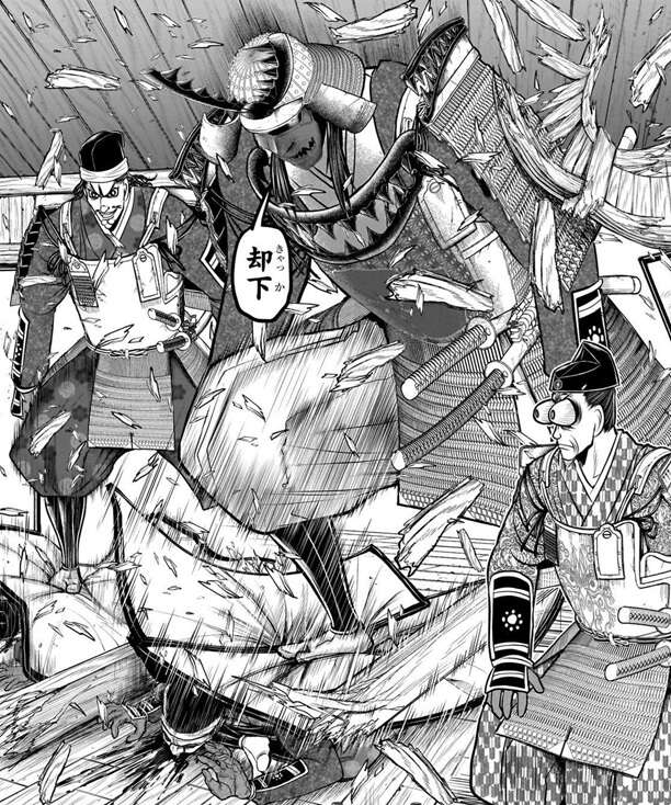 人間爆弾が顕家軍に着弾すると人がたやすく爆ぜて、鎧や骨が爆散すると顕家軍の堅い防御を広範囲に吹き飛ばします。土岐が部下を人間爆弾として顕家軍に投げ続けた結果、顕家軍本陣の陣形が崩れ顕家本人は重傷を負ってしまいます。