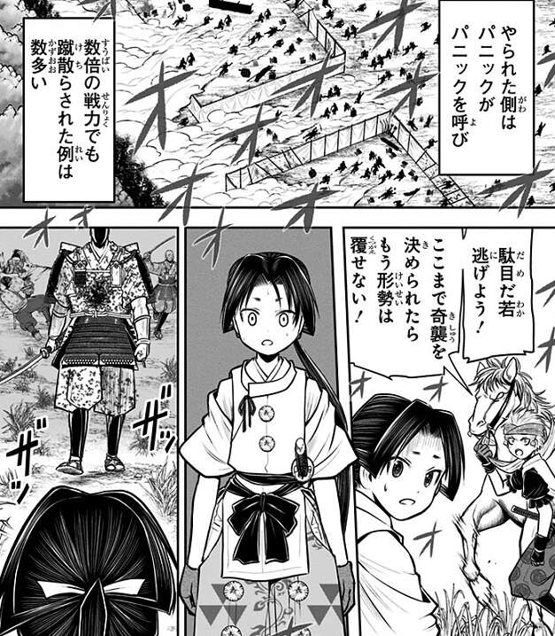 保科党を一時的に翻弄した国司・清原信濃守も、弱点を突かれると保科・四宮にあっけなく捕らわれてしまいます。国司軍を撃破した事で北信濃の動乱は諏訪神党の勝利かと思われましたが、瘴奸が裏山から四宮本陣を奇襲した事で「中」の戦場は一気に形勢は逆転し、保科・四宮軍は敗走を始めます。