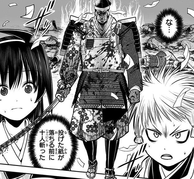 諏訪頼重直属の郎党「諏訪神党三大将」も3つの戦場に極秘の援軍として向かっていて、中軍大将の海野幸康も中央部の犬甘がいる戦場で小笠原軍を寄せ付けない活躍を見せます。海野幸康は女への欲を全て断ち、その欲を筋肉と闘争心に変換することで戦場では修羅のごとき力を発揮し、敵を何人も蹴散らしていました。
