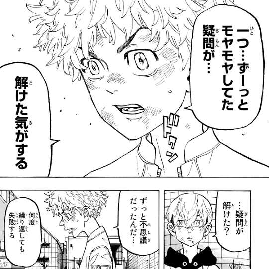 天竺四天王の鶴蝶から天竺総長 黒川イザナを救って欲しいと頼まれた武道は、黒川イザナは稀咲に利用されていると告げられます。その直後、東京卍會緊急集会で天竺にまとまるはずのない”S62世代”が一つになっている事を知り、さらに天竺と抗争する事がマイキーによって決定します。武道はこの抗争が稀咲の思惑通りに進んでいる疑念を持ち、一度現代に戻ることを決めます。