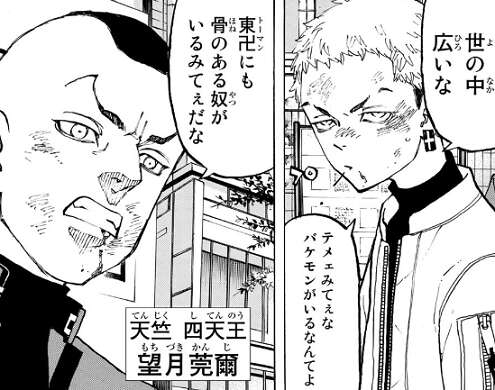 東卍をクビになった稀咲ですが、今度は横浜“天竺”総参謀として現れ武道に、“オレの東卍”を創る、と宣言して去っていきます。稀咲が去った後、残った武道達を天竺、望月隊が大人数でボコろうとしますが、そこに肆番隊の隊長&副隊長コンビが助けに現れます。