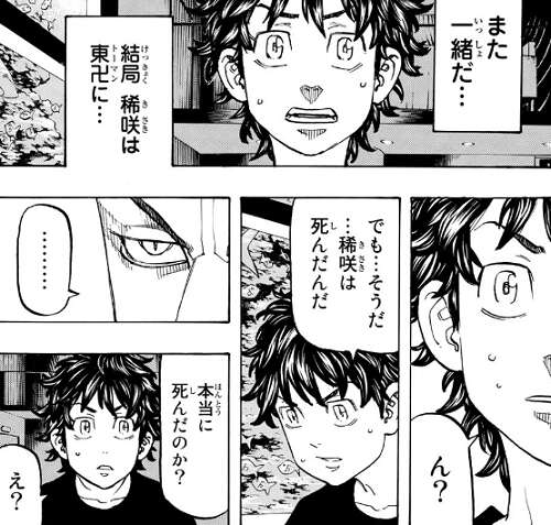横浜“天竺”に逆に乗り込みに向かった武道達は、肆番隊の隊長&副隊長の河田ナホヤとソウヤが天竺のモッチーこと望月莞爾と因縁があり、完敗していた過去がある事を知らされます。しかし、ナホヤとソウヤは完敗した過去を気にすることなく、横浜“天竺”に乗り込もうとします。一方、武道は稀咲もタイムリープを繰り返している可能性に気付きます。
