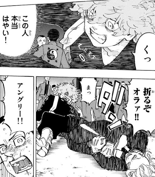 泣いたアングリーはリミッターが外れたように強くなり、タックルを仕掛けて再び関節技をきめようとした竜胆を一撃で倒してしまいます。一撃で倒された竜胆を見て動揺した蘭はアングリーを見失ってしまい、気が付くと後ろに回られたアングリーに蘭も一撃で倒されます。さらに灰谷兄弟を瞬殺したアングリーを見て、モッチーがアングリーの相手をしようと乱入してきます。