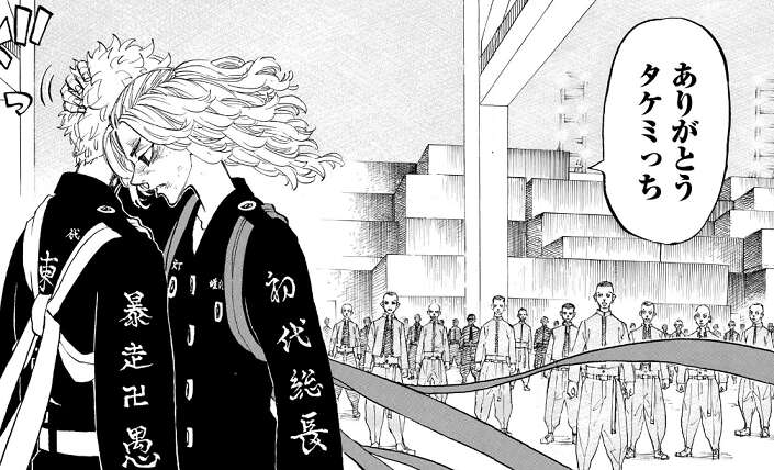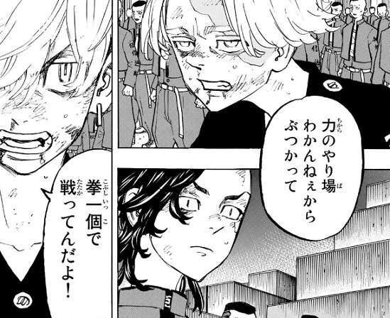 ヒナから、武道のタイムリープの話、ヒナが12年後に死ぬ話をマイキーとドラケンにしたと聞かされ、武道は驚きます。さらにマイキーとドラケンの二人は失意のどん底だったはずなのに、ケンカなんて出来るのかと武道は心配します。しかし、マイキーはまだ天竺は半分ぐらいの200人残っていると聞き、二万人連れてこい!と叫ぶ余裕を見せ、いつものマイキーが戻って来たと武道は安心します。