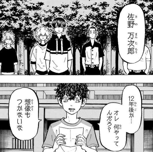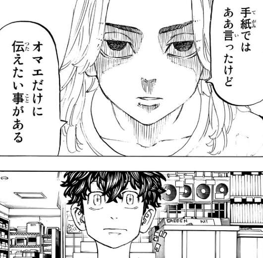 最後にマイキーの手紙が残り、ドラケンは本人も来ない事だし開けてみようと言い、マイキーの手紙を開封することにします。そこには12年前、東卍解散の時の、マイキーの皆に対するそれぞれの気持ちが書かれていました。その手紙を読んで武道は、現代のマイキーを探すのは野暮だったかな…、と思うようになります。