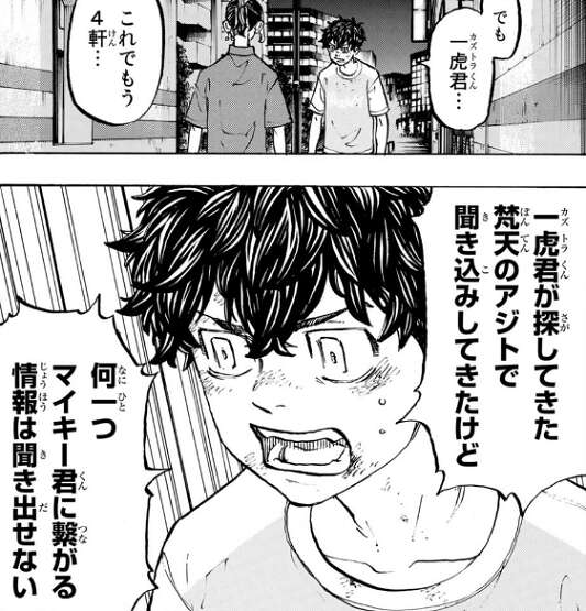 一度はマイキーを探すことを止めた武道ですが、挫けそうな時、オレがオレでなくなりそうな時、オレを叱ってくれ、と言われたことを思い出し、武道は再びマイキーを探し始めます。しかし、マイキーに繋がる情報を探って“梵天”のアジトを聞き込みますが、何一つ情報は聞き出せず、武道は焦ります。