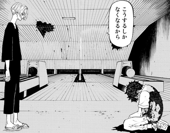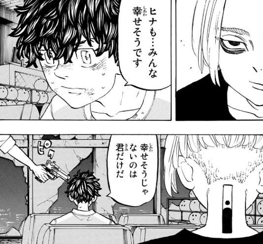 梵天のたまり場だったというボーリング場で、マイキーと再会した武道ですが、マイキーからはこれ以上何を求める?と、言われてしまいます。武道は結婚式の招待状を渡したかったと言い、ヒナもみんな幸せそうです、幸せそうじゃないのは君だけだ、とマイキーに話しかけますが、三途に銃を押し付けられ、殺すぞと脅されます。