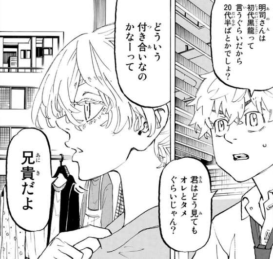 梵(ブラフマン)の首領・瓦城 千咒に誘われて原宿に行くと、そこには女の子が待っていました。女の子の正体が千咒だと分かり驚く武道ですが、そのまま原宿で一緒に買い物をすることになります。買い物をしている途中で千咒には兄が二人いて、その二人の兄とは梵(ブラフマン) No.2・明司 武臣と、元 東京卍會 伍番隊副隊長・三途 春千夜だと武道は教えられます。