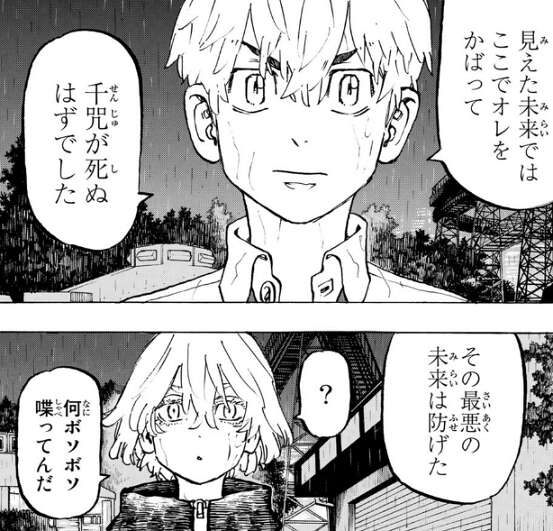 倒れてしまったドラケンに武道は、救急車を呼んで千咒が従業員に担架を頼んでいる事を伝え、絶対に助かると励まします。しかし、ドラケンは自分がこのまま死ぬのだと直感し、武道に自分を責めるなよ?オマエが過去に戻ってきたせいじゃねぇかんな、とドラケンは言い武道に自分を責めないように言い聞かせます。