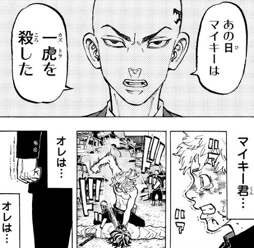 マイキーから、オレはオマエの敵か?と聞かれた一虎は、敵に決まってんだろーが!!!と答え、マイキーを芭流覇羅の幹部に手足を押さえつけて身動きを取れないようにし、鉄パイプでボコって本当に殺そうとします。