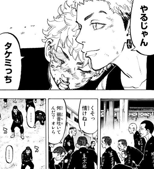 東卍が150人に対して芭流覇羅は300人と、東卍は数で不利な状況で抗争は東卍が押され気味な状況です。ドラケンも仲間を守りながら、半間の他に芭流覇羅を何人も相手をしていてなかなか半間まで辿り着けません。しかし、そんな状況で武道は一人ボロボロになりながらも戦い続けることで、他の東卍メンバーの気持ちを奮い起こさせます。