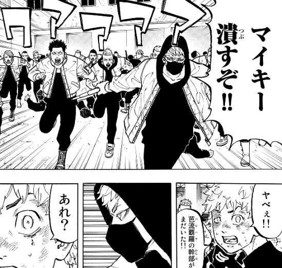 半間の周りにいた芭流覇羅のメンバーを全員倒したドラケンは、半間を一撃で吹っ飛ばします。一方、逃げる一虎を追っていたマイキーは芭流覇羅の幹部二人に不意打ちされ、3対1の状況で対決する事になり、一虎に徐々に追い込まれ始めます。