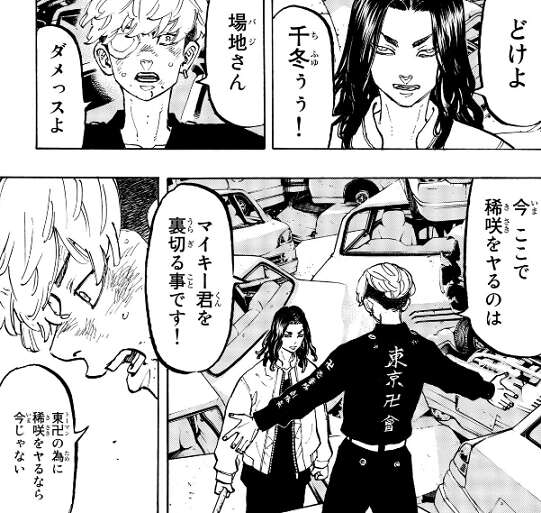 場地はいきなり現れると、稀咲を不意打ちにしてそのままボコろうとします。稀咲の部下に邪魔をされてしまいますが、それでも稀咲をヤロうとする場地を千冬は何とか止めようとします。武道も一緒になって場地を止めようとしますが、場地は二人を殴ってでも稀咲の所に行こうとします。