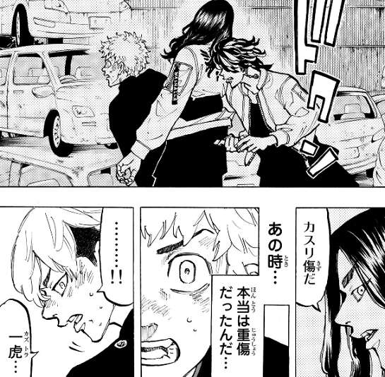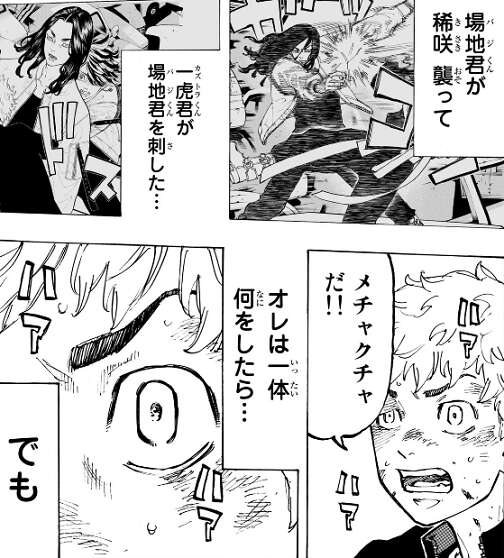 稀咲の所に行こうとしていた場地を、一虎は後ろから刃物で刺します。一虎に刺された場地を心配する武道ですが、場地の傷はカスリ傷のようで、武道に稀咲を殺るから黙って見ているように言います。色々なことが怒り混乱する武道ですが、一虎が場地を殺す未来を止めたと思い、後は自分が東卍のトップになる為に武道は稀咲を潰そうとします。