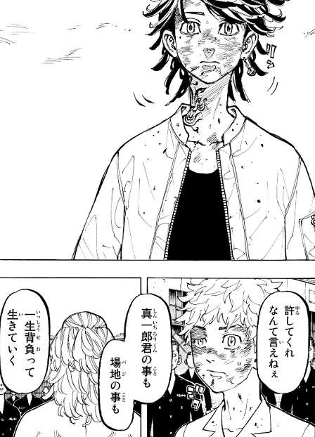 一虎に刺されて殺されるのではなく、場地は自らを刺して自決する事を選びます。なおも、マイキーと一虎は殺し合いを続けようとしますが、武道は林田を出所させる代わりに参番隊 隊長に任命してくれ、と稀咲がマイキーに頼んでいた事を、場地から聞きます。