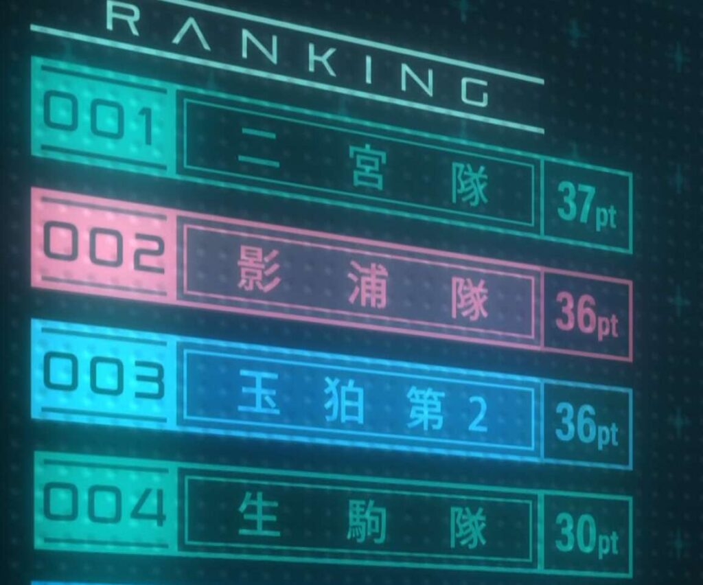 今回でROUND7、試合終了です。最後、ヒュースは東の罠にかかり落とされてしまいますが、それでも東隊を自主的にベイルアウトさせて生存点2点を獲得します。これで暫定的ですが、影浦隊と同点で玉狛第2は2位となります。最終ROUND8次第ですが、遠征選抜の条件「B級2位以上」をクリアすることも現実的になってきました。しかし、最終ROUND8では二宮隊と再び対決となる可能性が高そうで、二宮隊との対決は玉狛第2の大きなハードルとなりそうです。