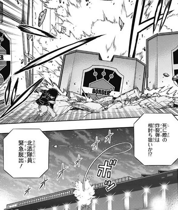 玉狛第2のダブルエース、ヒュースと空閑が影浦に最後の攻撃で止めを刺そうとします。しかしその時、壁から北添が出てきて、北添がヒュースと空閑を牽制し影浦を逃そうとします。