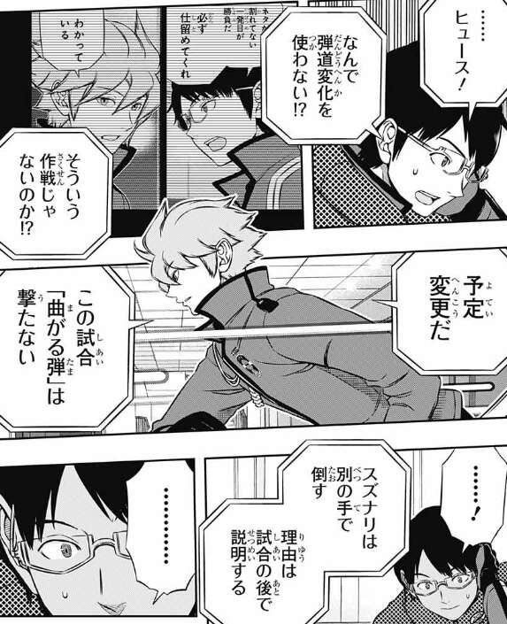 三雲はこの場でアステロイドと思わせて、バイパーを今度こそ撃つと思いますが今度もまっすぐしか撃たず、鈴鳴第一と打ち合いになります。三雲はヒュースに何故、弾道変化を使わないのか聞きますが、ヒュースは理由を言わずこの試合は「曲がる弾」は撃たないと言い、鈴鳴第一は別の手で倒す、理由は試合の後で説明すると言います。