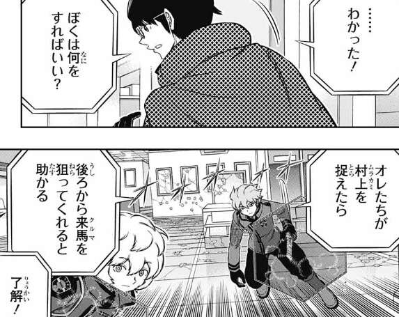ヒュースから考えがあると言われ、三雲はヒュースを信じて意見を聞きます。ヒュースは三雲に後ろから来馬を狙ってくれると助かると言い、三雲も来馬を狙い撃ちします。