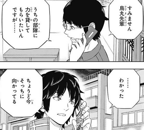 宇佐美に訓練室で出来ることを確認した三雲は、先輩である烏丸に連絡し自分のチームに力を貸して欲しいとお願いし、烏丸も快諾します。
