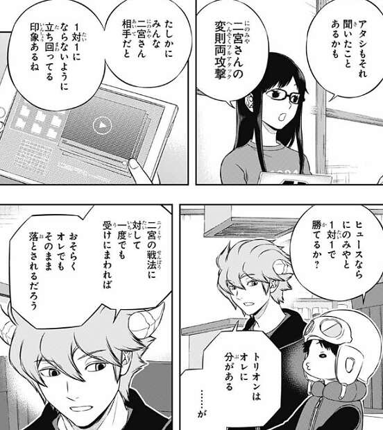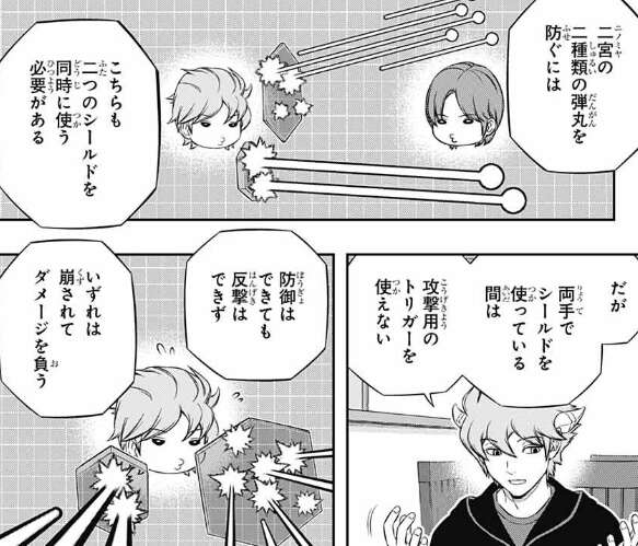 二宮の変則フルアタックを防ぐには、こちらも二つのシールドを同時に使う必要がありますが、その場合両手でシールドを使っている間は攻撃トリガーが使えず反撃が出来ません。防御は出来ても反撃が出来ずいずれは崩されてしまう、固めた相手を一方的に攻撃できるのが、二宮の戦法の強さだとヒュースは言います。陽太郎から言われ、自分が変則フルアタックを使った場合を想定しますが、単独行動でのフルアタックは防御がガラ空きになるリスクがあり、ノーガードのリスクを負ってフルアタックを狙うよりも味方と合流して連携する方が現実的だとヒュースは結論づけます。