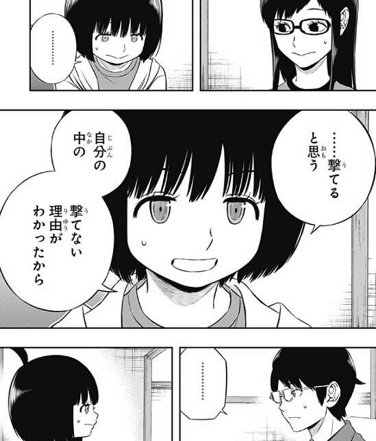 ヒュースの話を聞いて空閑は、雨取が守ってヒュースが撃つ作戦がかなりよさそうと言いますが、陽太郎から突然雨取からお知らせがあると皆へ発表します。雨取は次の試合、ふつうの弾も撃つと言い、自分自身も人を撃つと空閑や三雲に話します。