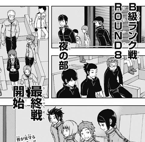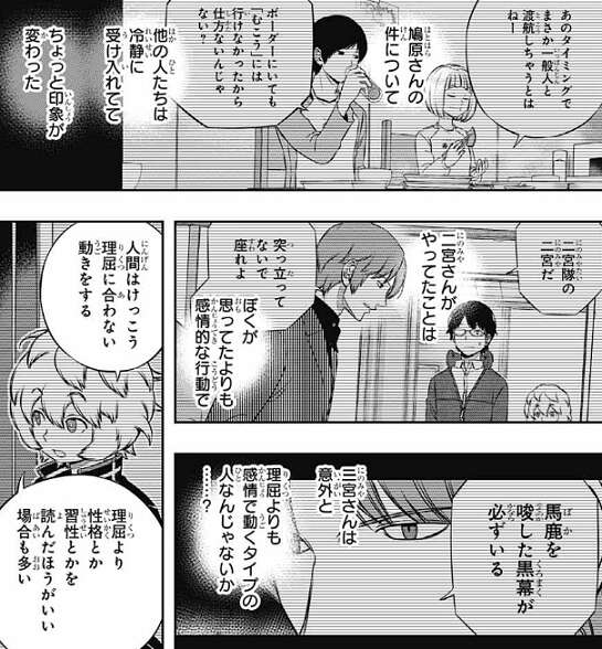 三雲は焼肉屋での二宮隊の発言を思い出し、二宮以外は鳩原の件を冷静に受け止めていた事で二宮隊の印象が変わります。最初に会った時の二宮はもっと感情的だったと思い、二宮は意外と理屈よりも感情で動くタイプで、最終戦で二宮と1対1の状況になれば二宮は多少のリスクがあっても1対1で勝負してくる、そういう展開があると三雲は考えています。