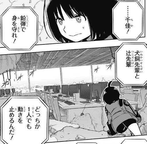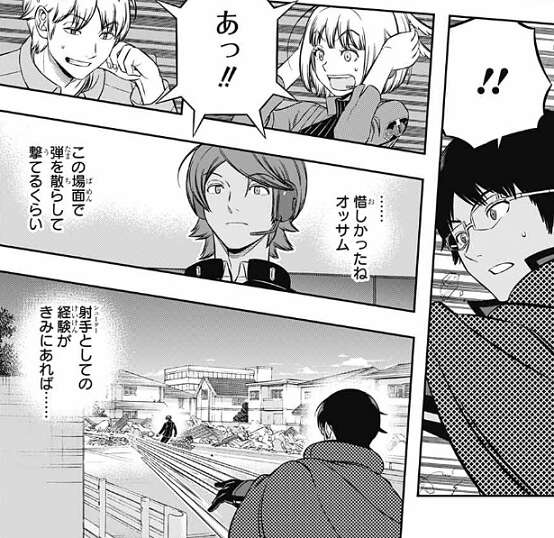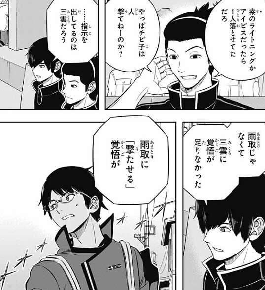 米屋は二宮への狙撃が素のライトニングかアイビスなら、1人落とせていた、やはり雨取は人を撃てないのか?と言います。しかし、三輪は指示を出していたのは三雲だ、雨取に「撃たせる」覚悟が三雲に足りなかった、と言います。