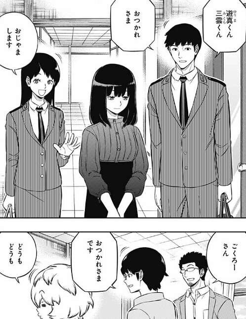 自分の事を説明していない林藤支部長に呆れる瑠花は、三雲と空閑に自分と陽太郎への敬意を忘れないように言います。瑠花に言わせると、ボーダーがここまで大きくなったのは、ほとんどが私達の存在と、唐沢の尽力に由るものという事だそうです。三雲はその態度、その尊大な感じから、唯我に通じるものがあると感じます。忍田本部長と本部長補佐の沢村は、瑠花を林藤支部長に任せた後、自動車で帰っていきます。
