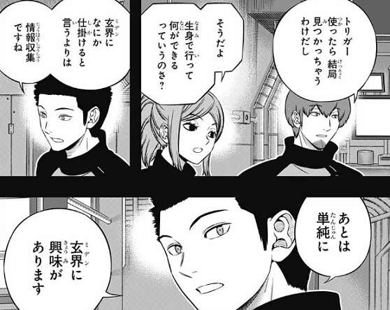 ガロプラは前回の攻撃時に、格納庫の更に地下深くにとても大きなトリオン反応に気付いていて、それが母(マザー)トリガーではないかと推測しています。ミデンの著しい成長は母(マザー)トリガーを手に入れたことに起因するのではないか、しかし母(マザー)トリガーを手に入れるなんてことが、現実に可能なのか、そこにラタは個人的な興味があると言います。すると林藤支部長はあっさりと、数年前に母(マザー)トリガーを手に入れたことを明かします。