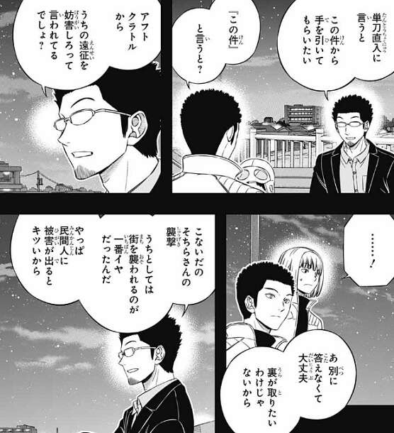 しかし、穏便な作戦が失敗するとガロプラが手詰まりになって、最終手段として街を襲う可能性もあり、林藤支部長は『取引』としてミデンの遠征を妨害する事から手を引いてくれたら、アフトクラトルへの遠征を50日くらいは遅らせると言います。