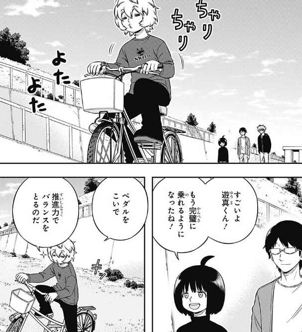 遠征選抜試験を前に、玉狛第二の隊員は集まって空閑の自転車の練習を見ています。以前に比べると、乗りこなしていますがスピードはまだ、よたよたとしたレベルです。