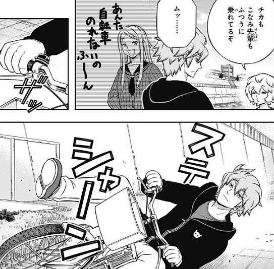 ヒュースは、移動のためにわざわざこんなバランスの悪い乗り物に乗る必要があるか?と疑問を口にします。車輪が前後二つしかないから、オレから見れば曲芸に近いと言っています。こっちの世界は地面がかなり平らだから、自転車に乗れると便利だ、トリオンも食わないし、と空閑がヒュースに説明します。