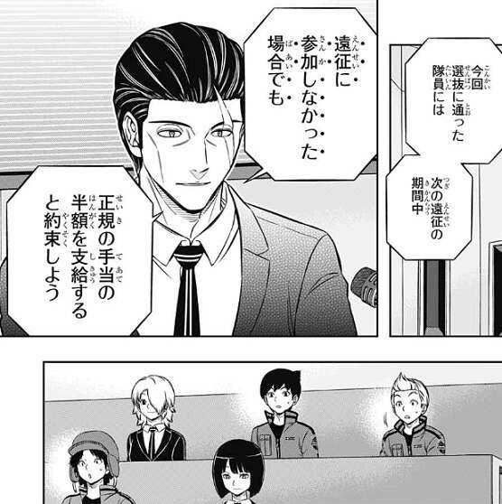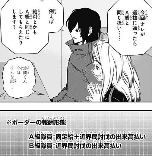 ここでB級14位、漆間隊の隊長 漆間から、遠征に行かなくても選抜に通った評価は消えないという、その「評価」で具体的に何が変わるんすか?という質問が出ます。遠征部隊は今まではA級の仕事だったので、今回選抜に通ったら給料がA級と同じにしてもらえたりします?と、漆間が発現します。正直それくらいの旨味がないと、試験受けるより防衛任務入れといたほうが儲かるかな、と漆間は主張しますが、相変わらずがめついなあ、と周りから言われています。