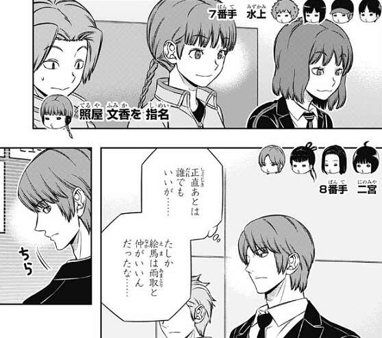そして二宮の番ですが、二宮は正直誰でもいいと考えますが、その時絵馬は雨取と仲が良かった事を思い出します。そして、二宮はちらりと絵馬の方を見ます。
