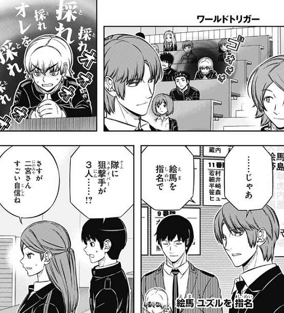 絵馬が二宮に、“オレを採れ”と念を送っています。それが通じたのか、二宮は絵馬を指名し、二宮の隊は東、雨取、絵馬とスナイパー三人となり、樫尾や橘高が驚いています。