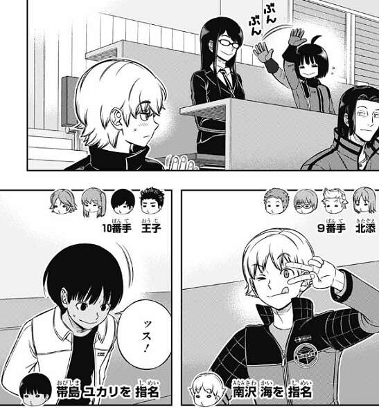 香取は三雲と同じチームになって驚いています。そして、諏訪におとなしく木虎とかにしといてよ!と文句を言っています。三雲も香取が同じチームという事で、少し複雑そうです。古寺が木虎を、柿崎が犬飼を、村上が蔵内を、水上が照屋をそれぞれ指名ます。