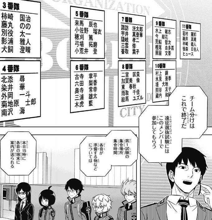 さらに、第1試験ではA級隊員が審査する側にまわる、という説明が忍田からあります。A級の人たちが審査官と聞き、三雲は驚きます。